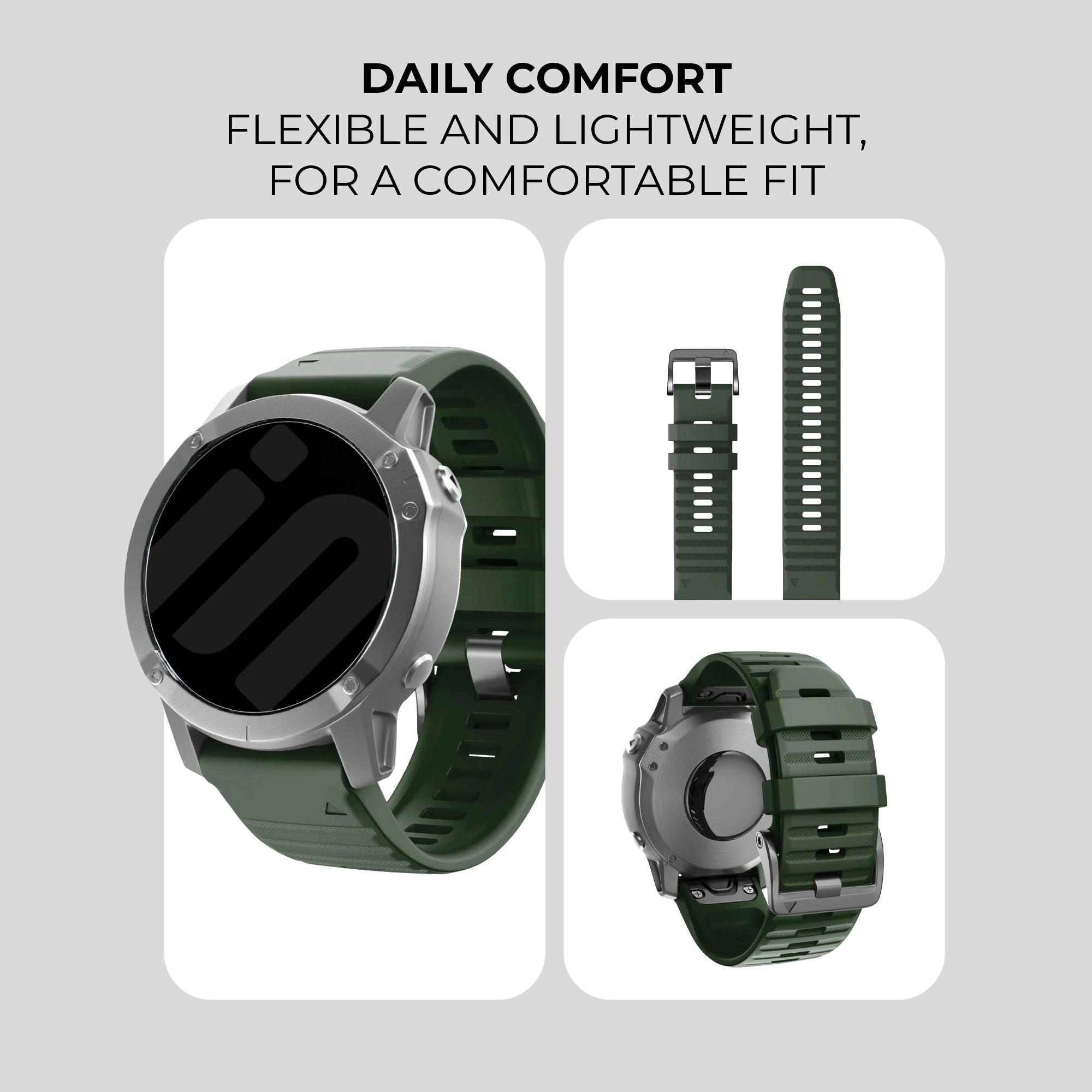 Silicone is a great material for watch straps, because it's very durable and water- and sweat resistant. This means they are very versatile straps, being suitable for daily wearing and sports or swimming.